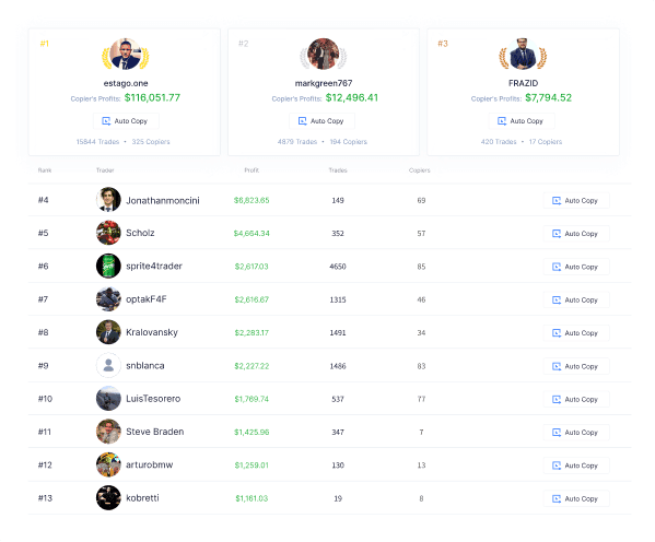 Diversify your trading and try following the strategies of our Lead traders. Mirror their trading activity. They trade, you trade!